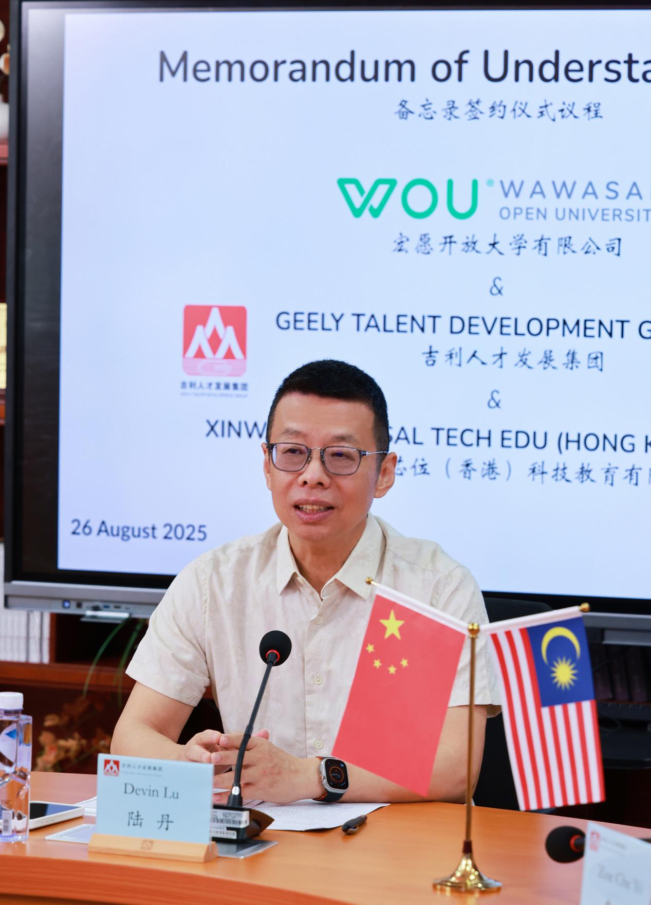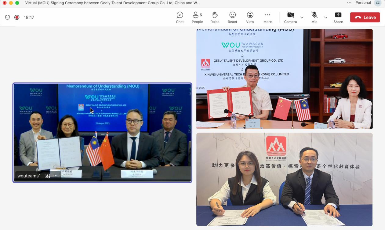 2025年8月26日,吉利人才發(fā)展集團、全球芯位(香港)科技教育有限公司與馬來西亞宏愿開放大學正式簽署合作備忘錄(MOU),標志著三方在教育領域的戰(zhàn)略合作全面啟動。此次合作旨在整合各方資源,共同推動高等教育國際化進程,尤其是在碩士及博士課程開發(fā)、雙學位項目以及線上教育平臺建設等方面開展深度合作。早在今年7月,全球芯位與宏愿開放大學已就本次簽署的合作備忘錄(MOU)進行過深入交流。